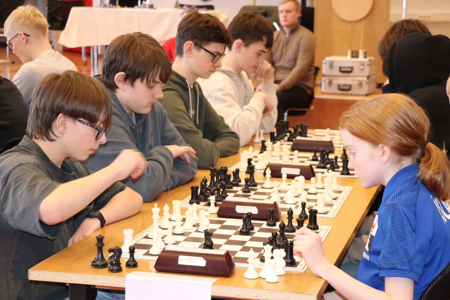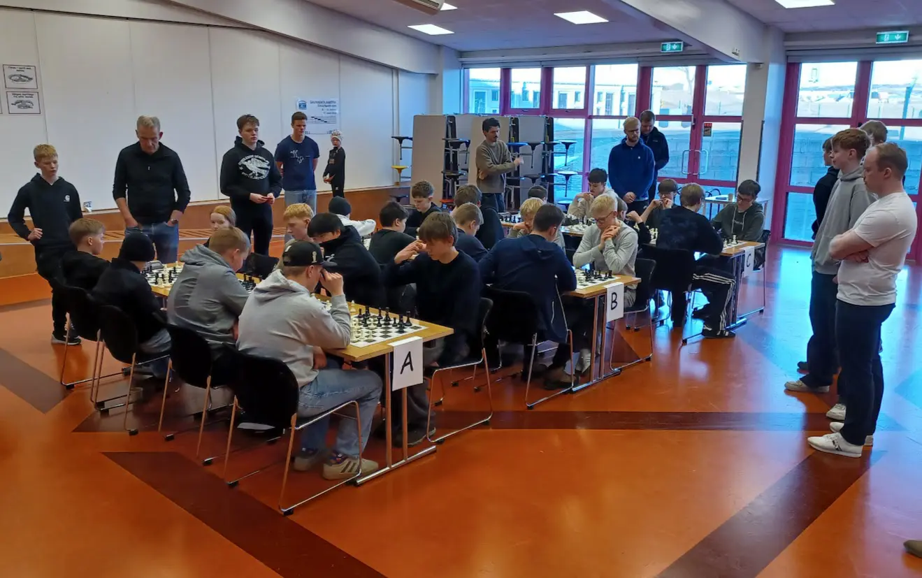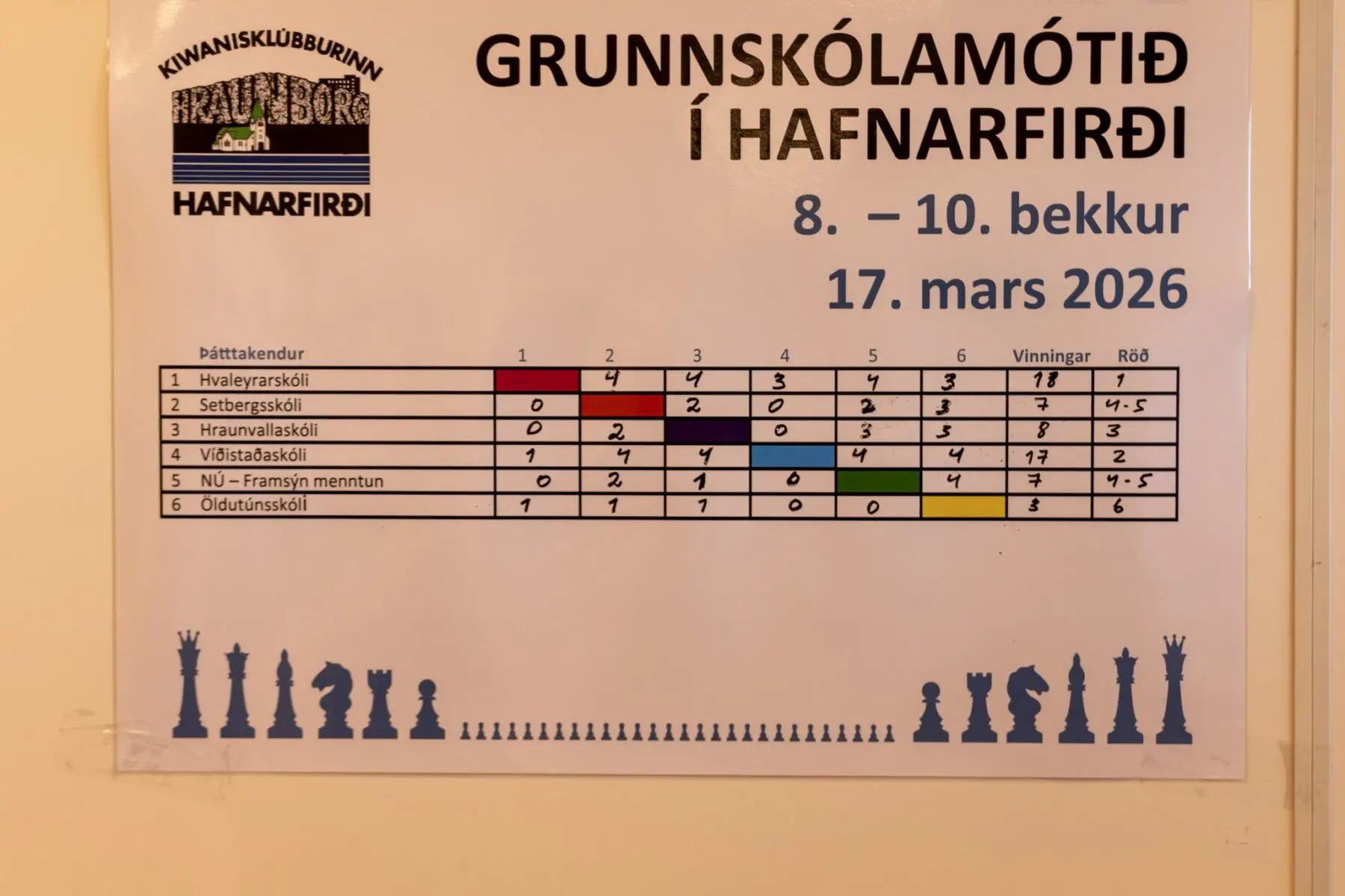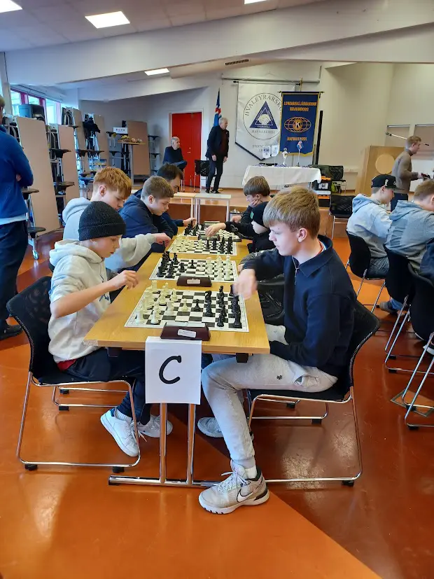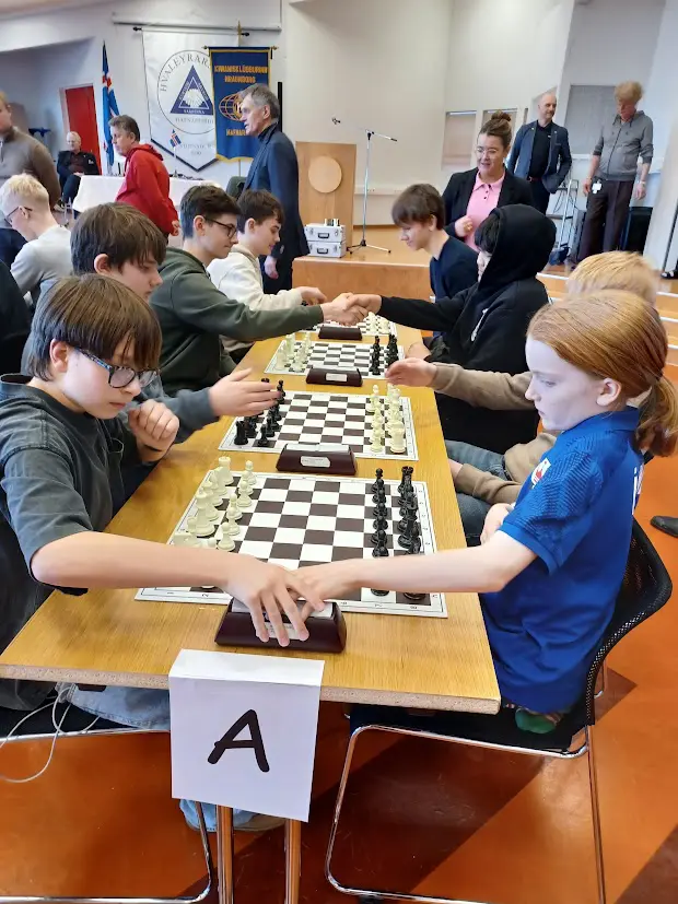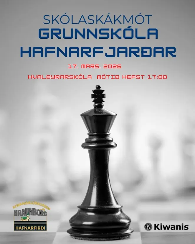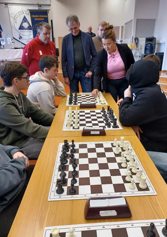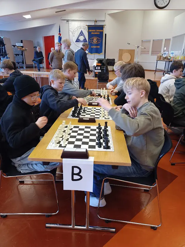 The chess tournament for 8th–10th graders in the primary schools of Hafnarfjörður took place at Hvaleyrarskóli yesterday afternoon. Chess teams from six schools, a total of 36 chess players and 12 team leaders, took part. Ægir Magnússon, chess teacher at Hvaleyrarskóli, welcomed the competitors on behalf of the school. The tournament is a collaborative project between the Kiwanis Club Hraunborg and the youth centers of the primary schools.