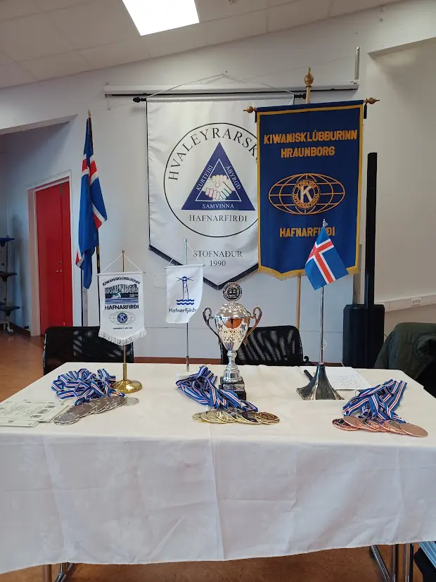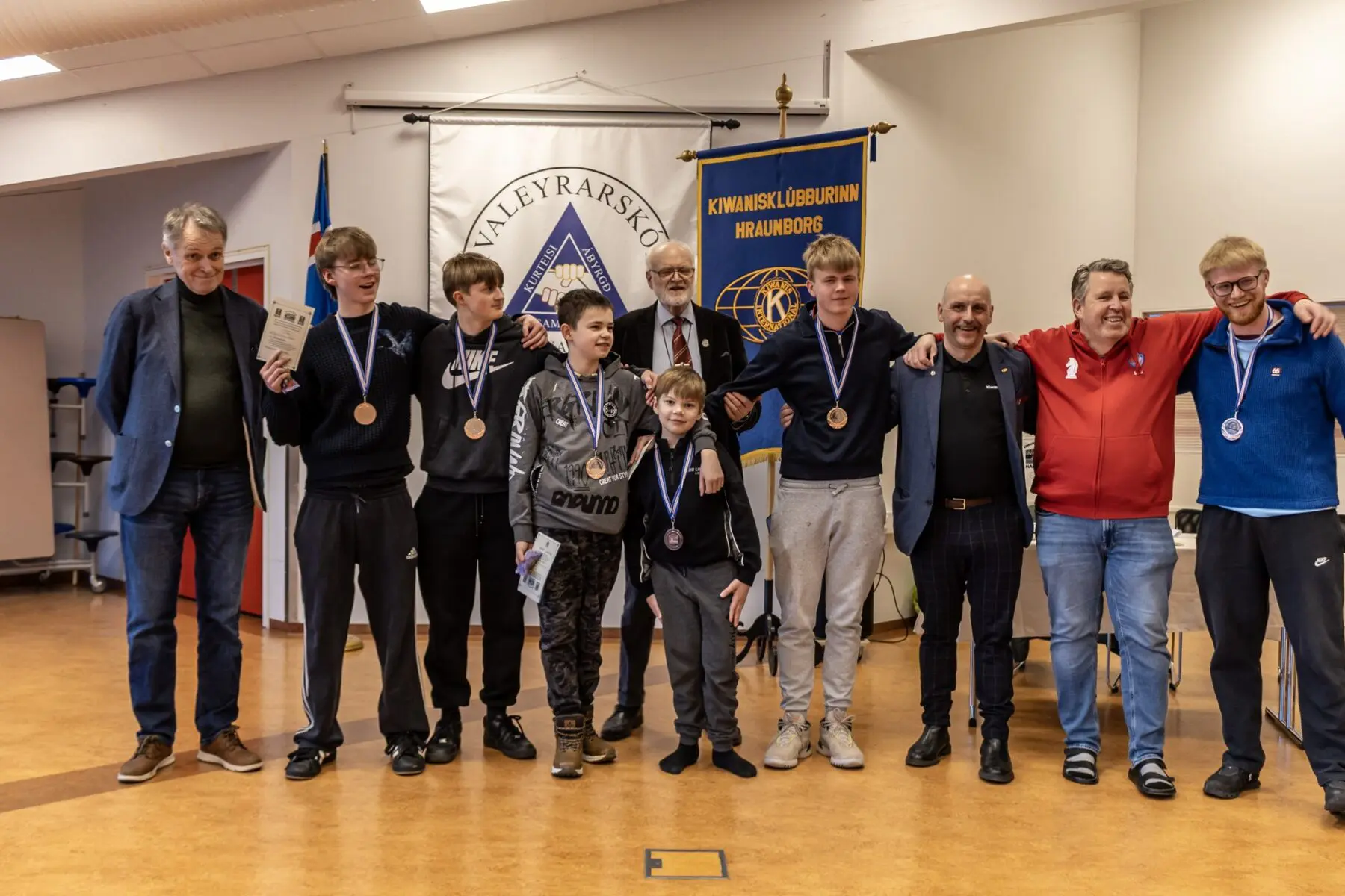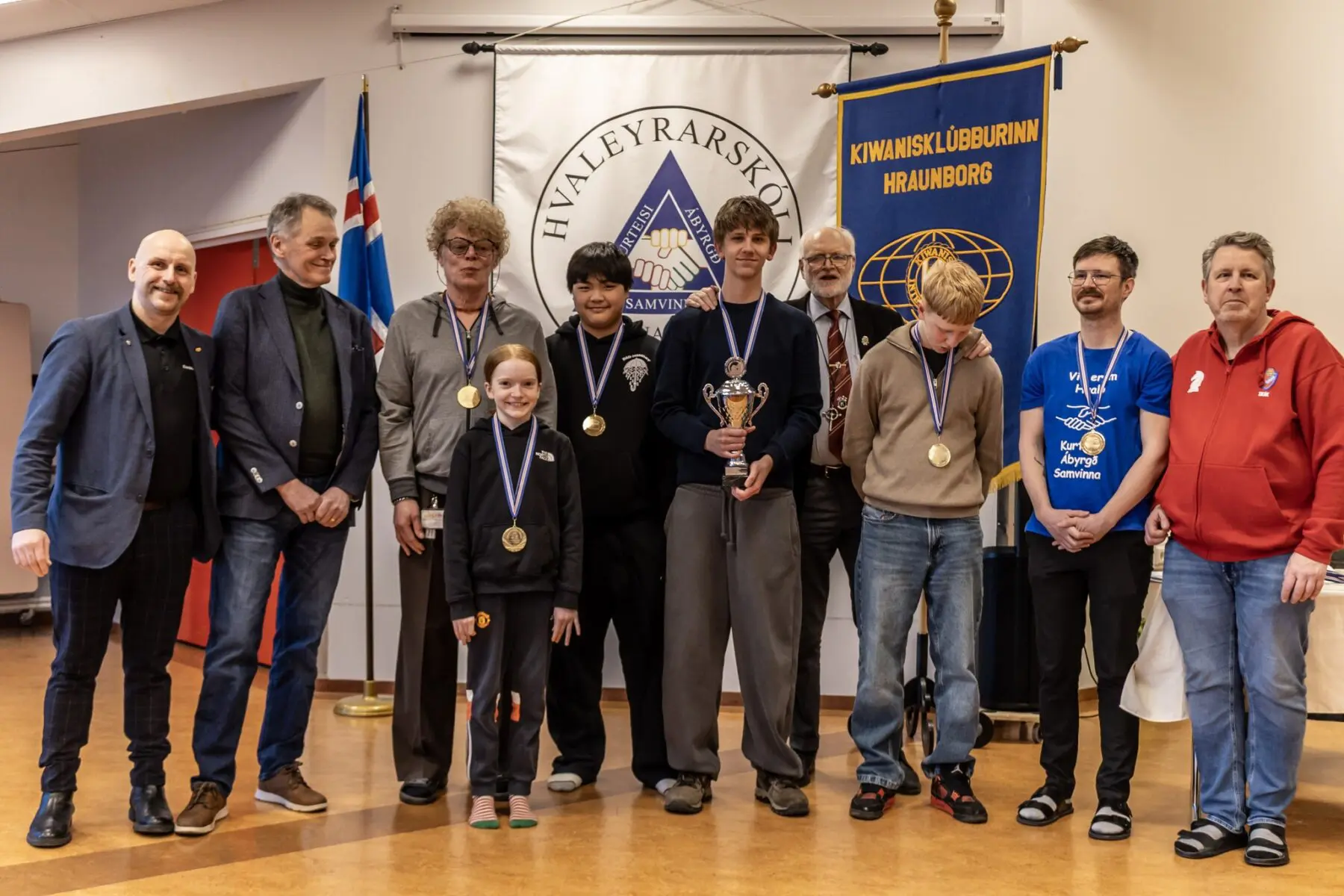 “We at Hraunborg are grateful to be the sponsors of primary‑school chess tournaments here in Hafnarfjörður by providing medals, a trophy and refreshments,” said Guðni Freyr Ingvason, president of the Kiwanis Club Hraunborg. He thanked the competitors for fair play and good sportsmanship and congratulated the winners. He thanked Helgi for firm yet gentle leadership and Auðbergur for refereeing, and presented them with books as gifts.