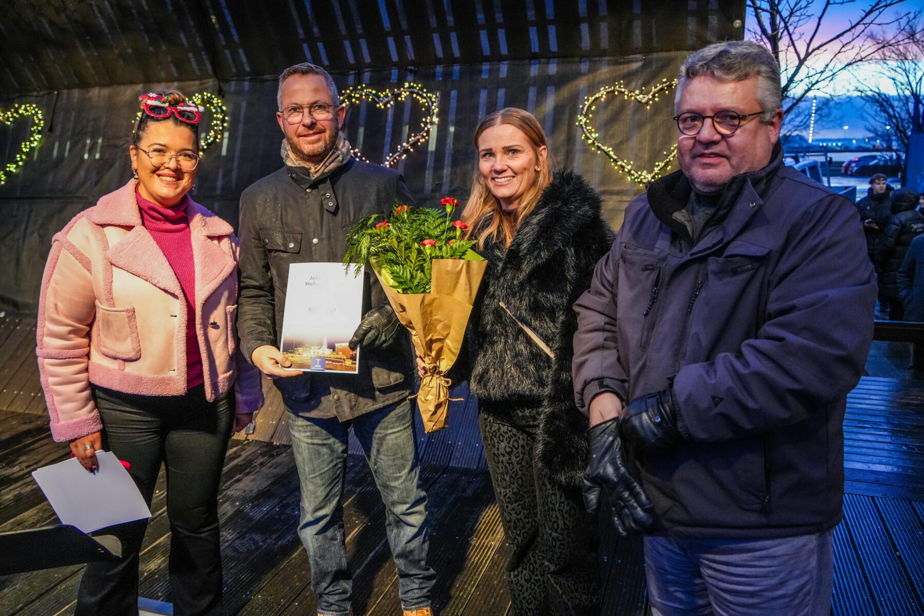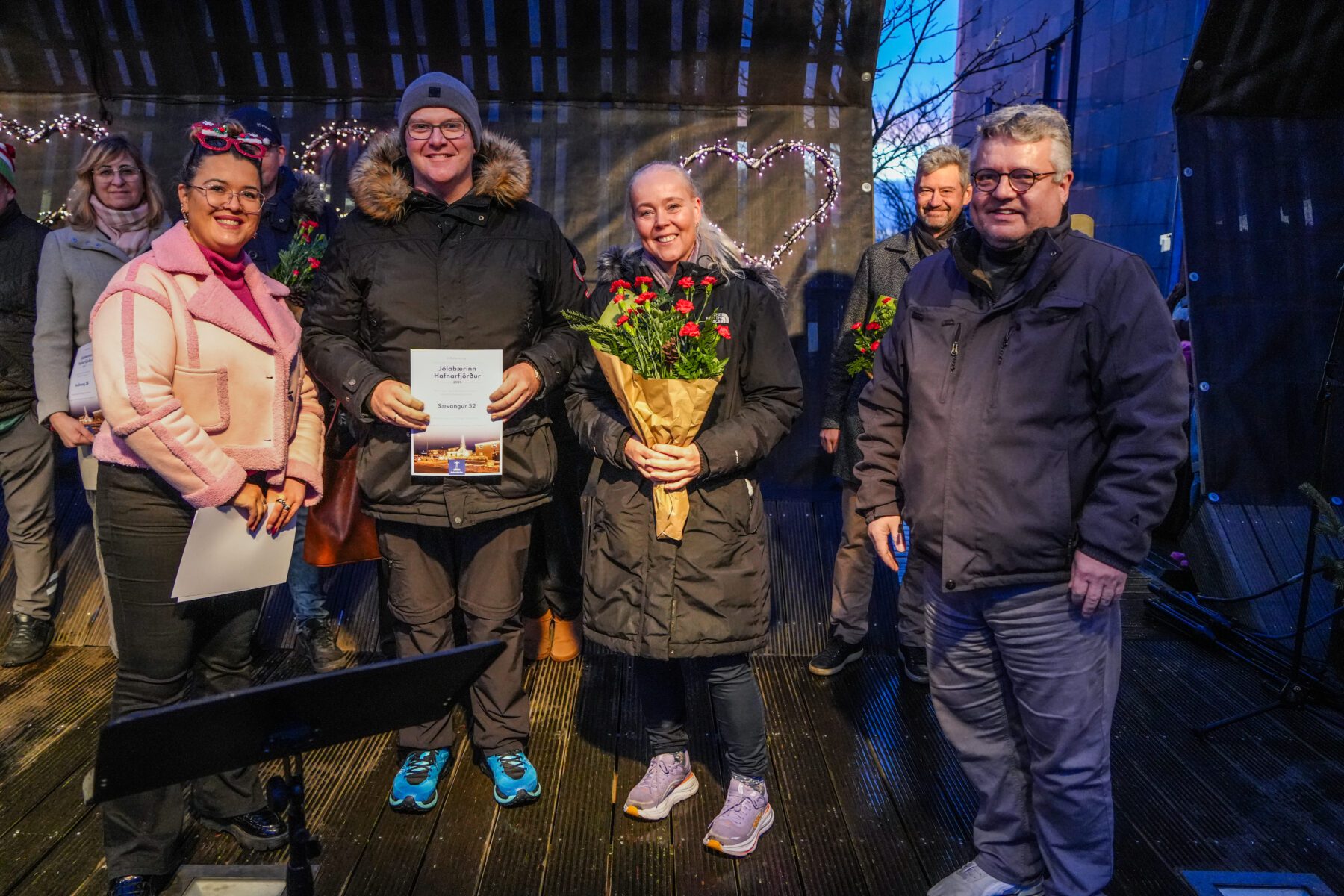 Nine homes and two businesses received recognition for their Christmas decorations at the Christmas Village on Friday. Two businesses were also awarded, Burkni and the shop Kaki. The Culture and Tourism Committee of Hafnarfjörður selects the best-decorated homes based on tips from residents.