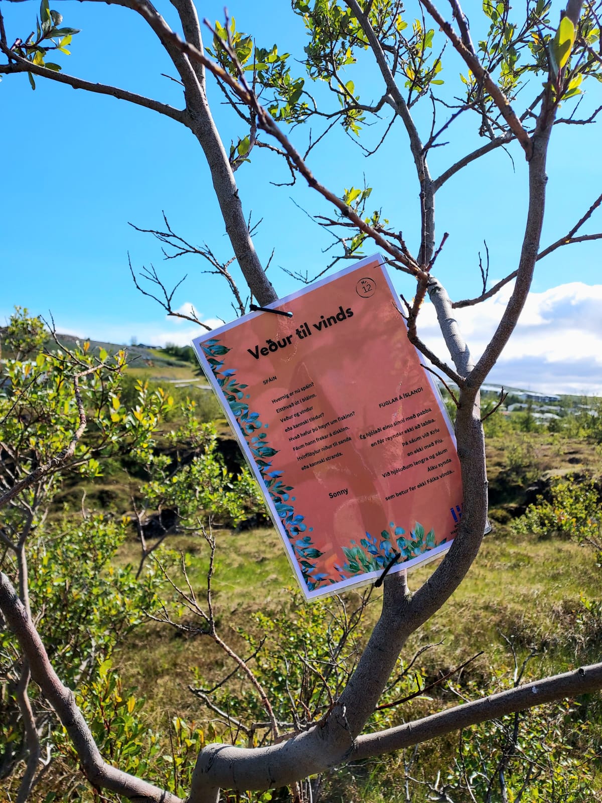 In collaboration with the school libraries of Hafnarfjörður, boxes, forms, envelopes, and promotional materials were distributed to all the town’s schools, where students were encouraged to submit poems and flash fiction. As a result, over 107 valid entries were received within the deadline, which have now been laminated and placed around the town.
