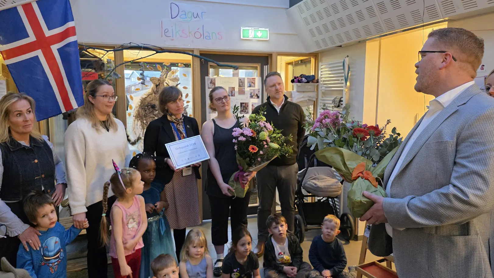 Sigurður Sigurjónsson, chair of the Association of Preschool Directors, presented the award to Inga Líndal, the head of Álfasteinn, at a formal ceremony at the preschool this morning. Valdimar Víðisson, Mayor of Hafnarfjörður, also presented flowers and, together with Kristín Thoroddsen, chair of the Education Council, congratulated them on behalf of the municipality.