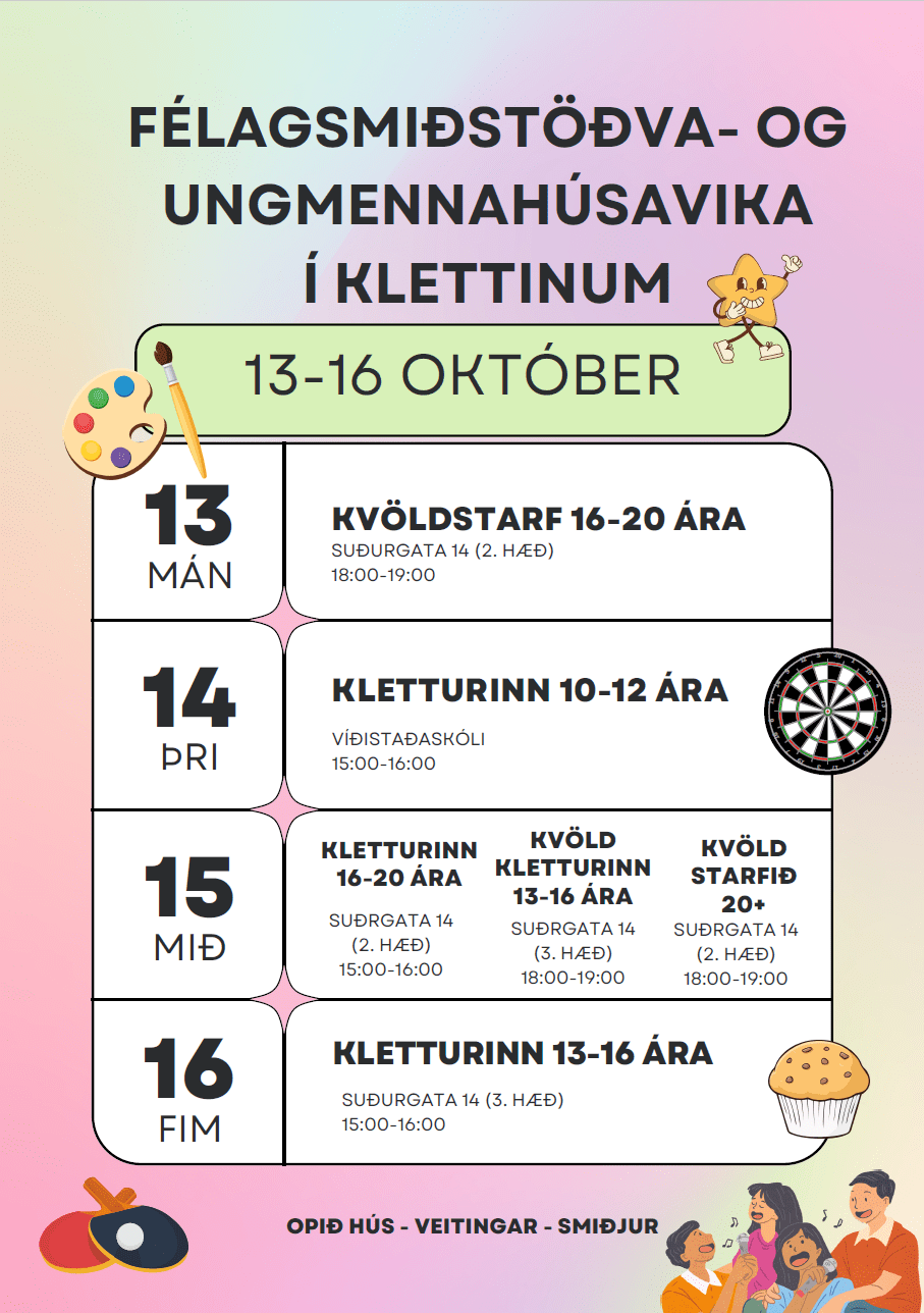 Youth and community center activities will take place in Hafnarfjörður next week. The week aims to highlight the importance and value of these centers for children and young people. Parents, guardians, siblings, friends, and other relatives are encouraged to learn about the activities in their local centers, with a variety of events on offer.